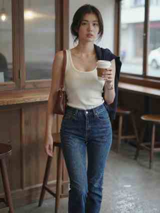 She pauses beside a wooden counter and tall stools, her torso slightly angled while her gaze stays steady on the lens. A cream ribbed tank top sits close to the body, paired with dark high-waisted denim that holds its shape with honest creases at the waist and hips. A dark jacket rests casually over one shoulder, and a worn brown leather shoulder bag leaves a faint impression where the strap crosses. In her hand, a takeaway cup is held at chest height, the lid showing a hint of condensation. Her hair is loosely gathered, with a few stray strands framing her cheeks; makeup is minimal, letting natural texture and small details show through. Window light drifts across her collarbones and jawline, turning the scene into a quiet, unposed moment.