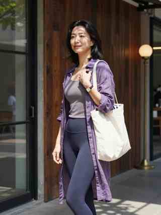 She moves through clear daylight with an easy, self-possessed calm. Shoulder-length hair lifts slightly as she walks, and a small, unforced smile rests on her face, as if she’s just left a brief conversation behind. An open purple shirt drapes loosely over a light tank, paired with dark fitted leggings that keep the silhouette clean and effortless. One hand steadies the strap of a plain canvas tote on her shoulder; a simple wristwatch catches the sun for a second before the light slides away. Behind her, warm wooden panels and a glass doorway frame a quiet street-side moment, with soft shadows pooling on the pavement and making the scene feel candid and close.