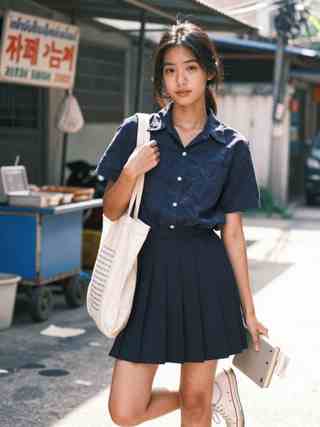She stands in a narrow street washed by soft daylight, her weight settled into one leg while the other bends slightly, relaxed without looking careless. A navy short-sleeve button-up shows real creases and wear, paired with a matching pleated skirt that falls cleanly and moves with quiet ease. A light canvas tote hangs from her shoulder, and in her hand she holds a thin book with slightly worn edges. Side light skims her cheek and collarbone, catching subtle skin texture and a hint of moisture near the nose. She looks straight at the camera with a calm, measured gaze—open, but not offering too much. Behind her, a cart and an aged sign blur into the background, leaving the moment feeling unposed and lived-in.