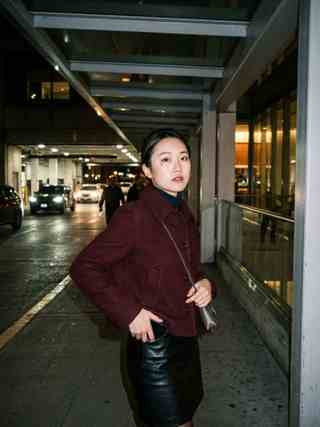 Night has just settled, and she holds still under a sheltering edge of the outdoors. Her shoulders angle slightly, weight set into her right leg, left foot pointed out with intent. A deep wine-red cropped wool coat pulls in cleanly at the waist; the diagonal front sharpens her silhouette. The high-waisted black leather skirt catches a restrained, cool shine, showing honest creases where it bears tension. A close turtleneck frames her neck, and slim-heeled ankle boots give her stance a quiet edge. Her East Asian features keep their natural asymmetry, anchored by a tiny tear mole under the left eye. Pores, faint dryness, and soft acne marks remain visible. She meets the camera without yielding, lips held to a near-smile. One hand slides a phone into her coat pocket; the other thumb lingers on a small clasp, mid-motion. Behind her, glass and metal lines intersect in blurred light.