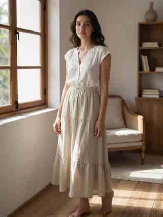 Warm afternoon light slips through the half-open wooden window frame and settles across her face. She stands with a slight turn, her weight resting on her left leg, poised without trying. Her Arab features feel honest, including a small pale birthmark on the bridge of her nose that makes her look even more real. Skin texture stays visible, with faint traces of freckles and a soft shadow under the eyes. A restrained smile lifts one corner of her mouth, and her gaze meets the camera now and then, like a familiar presence noticing you. The light beige cotton-linen dress falls in layered, asymmetric folds to mid-thigh, while a simple white linen shirt drapes gently, its embroidered neckline kept quiet. Her hands hang empty at her sides, calm and unguarded.