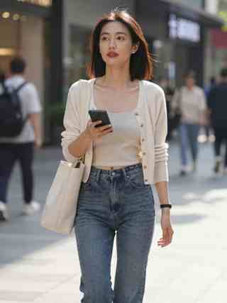She moves forward at an unhurried pace, sunlight settling softly along her collarbones and the curve of her neck. A light knit cardigan hangs open over a matching camisole, paired with high-waisted jeans that keep the silhouette clean and effortless. Her phone rests in one hand, thumb hovering as if she has just checked a message and chosen not to answer yet. A simple tote bag sits on her shoulder, swaying lightly with each step. The short, straight hair catches a thin rim of brightness, and her makeup stays minimal—polished brows, muted lips, and a calm expression. Her gaze lifts past the blurred passersby toward something ahead, composed and self-possessed, as the street behind her fades into soft motion.