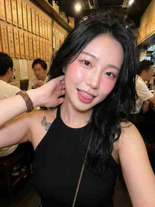 A young woman fills the frame in a close selfie, looking straight into the lens with a playful expression and the tip of her tongue slightly out. Her long black hair falls in loose waves with a few flyaways near the hairline, and the dewy sheen on her cheeks and nose catches the light like a small spotlight. One hand reaches behind her neck, a brown leather-strap watch visible at the wrist. She wears a black ribbed sleeveless top, and a butterfly tattoo sits clearly on her right shoulder. Shot in a vertical, intimate crop, the face is sharply focused while the background falls into soft blur, where warm restaurant lighting and rows of wooden menu slats hint at a lively table-side scene.