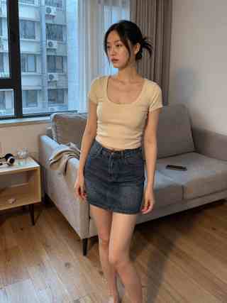She pauses in the walkway by the sofa, facing the camera while turning her shoulders slightly toward the light. One leg bears her weight and the other reaches forward a touch, like she’s just stopped mid-step. Her East Asian features are distinctive without feeling sculpted, with a natural bridge, softly full lips, and a subtly pointed chin. Real skin texture shows through, including faint under-eye blue and a couple of small blemish marks. Her makeup is nearly invisible, leaving only a balm-like sheen on her lips and brows that follow their natural growth. Black hair is gathered into a low ponytail, with loose strands lifting near her ear. A warm beige ribbed knit top frames her collarbones, and a high-waisted dark denim skirt defines her waist. She hooks a jacket in one arm and rests her fingertips on her phone, meeting the lens with a quiet, guarded calm. Behind her, a half-drawn curtain and a side table with a glass and earbuds hint at a recent return home.