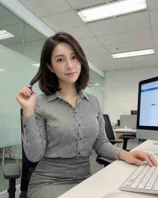 A people-focused office portrait shows a woman seated at a desk, meeting the camera with calm eyes and a soft, closed-lip smile. Her side-parted bob frames her face, with a slight wave at the ends. She turns her torso in a three-quarter angle, lifting her left hand to lightly hold a small lock of hair while her right hand rests near a white keyboard on the desktop. A black-and-white vertical striped button-up shirt, neatly buttoned with a crisp collar, pairs with a fitted gray high-waisted skirt. Overhead ceiling panels cast even, cool-toned light, and the medium framing keeps her face and hands clear. A monitor edge on the right and glass partitions behind add clean, modern lines—like a quiet pause captured in place.