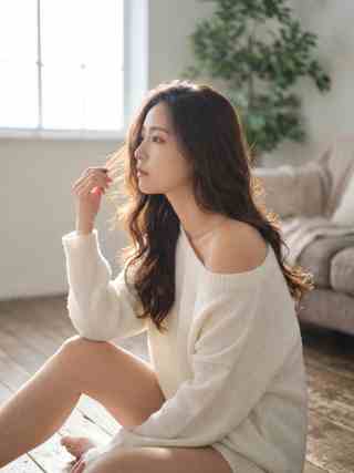 This people-focused portrait captures a quiet side profile, her gaze turned away and her lips resting in a calm, thoughtful line. Long wavy hair falls over her shoulder, with a bright rim of backlight tracing a few loose strands. She sits on a wooden floor with one knee drawn up, raising her hand to gently hold a small lock of hair near her face. An oversized cream knit sweater drapes softly, the neckline slipping to reveal one bare shoulder and the wool texture visible along the cuff and body. The framing stays at a medium distance, while soft window light blooms behind her; a sofa and leafy plant fade into a shallow-focus blur, like a hush held in the air.