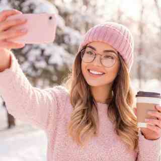 This people-focused portrait captures a young woman mid-selfie, smiling with teeth and looking toward her raised phone. A pink ribbed beanie frames her face, while round wire-frame glasses catch a soft reflection over her bright eyes and defined brows. She tilts her head slightly, left arm extended to hold a pink-cased smartphone, and her right hand lifts a takeaway coffee cup with a dark lid; her light pink manicure is visible on the cup. A fuzzy pastel sweater adds plush texture across her shoulders and chest. Framed from the chest up, the background falls into gentle blur with snow-covered shapes and bright bokeh, and warm natural light rims her wavy hair like a thin halo.