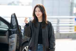 A young woman stands in the center of the frame with layered, shoulder-length hair softly catching the light along the edges. Her head is turned slightly and her gaze drifts off-camera, paired with a gentle smile and relaxed cheeks. She lifts one hand near her chest to form a neat finger-heart gesture, while her other arm rests naturally at her side. A black jacket with a visible front zipper and ribbed cuffs sits over a black top, finished with blue denim jeans at the waist. Bright daylight sharpens her face and hand, while the background fades into a creamy blur of a railing and an open car door, letting the moment feel candid and airy.