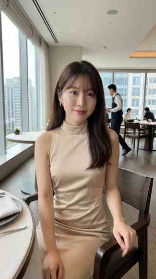 This people-focused portrait centers on a young woman seated by a large window, meeting the camera with a gentle, steady smile. Wispy bangs frame her forehead, and her dark hair falls over one shoulder, drawing attention to her relaxed eyes and softly defined lips. She sits upright in a wooden chair, torso angled slightly, with one hand resting on the armrest in a calm, composed gesture. Her sleeveless, high-neck satin dress in a warm neutral tone catches the light, showing subtle sheen and natural folds across the waist. Soft daylight from the side smooths the shadows on her cheeks, while the vertical, mid-length framing keeps her face crisp. In the background, dining tables and distant figures fade into a quiet blur, like a hush behind her.