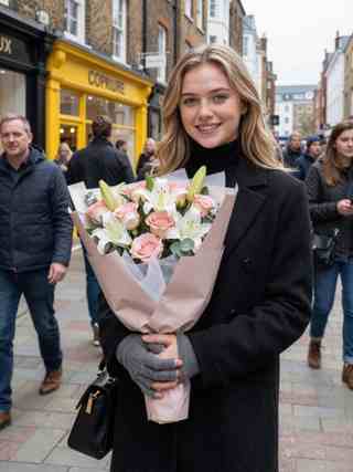 This people-focused street portrait centers on a young woman facing the camera with a gentle, closed-lip smile. Her light, shoulder-length hair falls in loose waves around her face, and her eyes meet the lens with an easy steadiness. She stands relaxed, shoulders slightly angled, holding a large bouquet close to her chest; pale wrapping paper frames pink roses and white lilies, with a few green leaves tucked between petals. A dark, heavy coat and black turtleneck set a clean outline, while gray fingerless knit gloves wrap her hands as they clasp the stems. Shot at about eye level in a medium frame, the subject is crisp and bright against a softly busy street of passersby and shopfront color, like a quiet pause in the crowd.