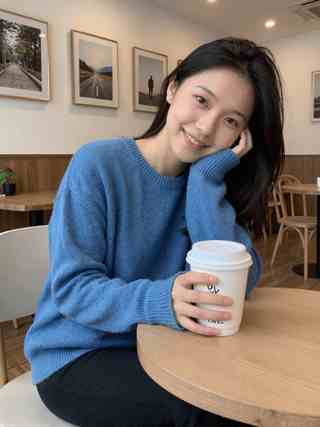 画面以人物为主:她长发自然披在一侧,眉眼放松,带着轻轻的笑意望向镜头。上身穿着蓝色针织毛衣,袖口罗纹清晰,质地显得柔软。她微微前倾坐在木桌旁,一只手托着脸颊,另一只手稳稳握着带白色杯盖的外带纸杯。室内顶灯带来温暖而均匀的光线,背景墙上几幅装框照片被虚化成安静的陪衬,像一层轻薄的光晕把这瞬间包住。